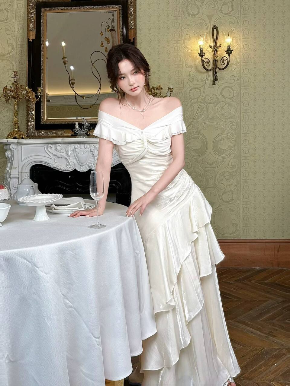 Элегантное белое платье с открытыми плечами на выпускной