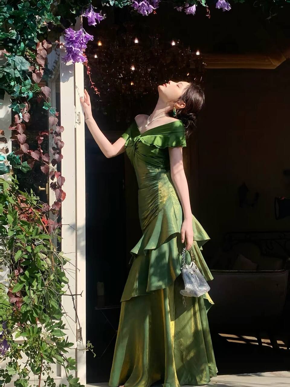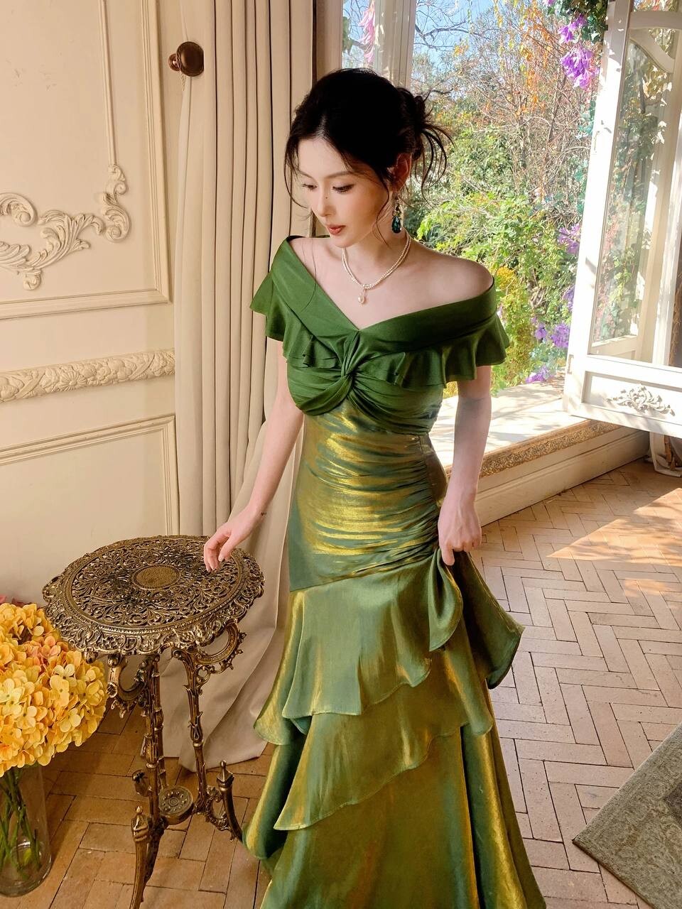 Элегантное зеленое платье с открытыми плечами на выпускной