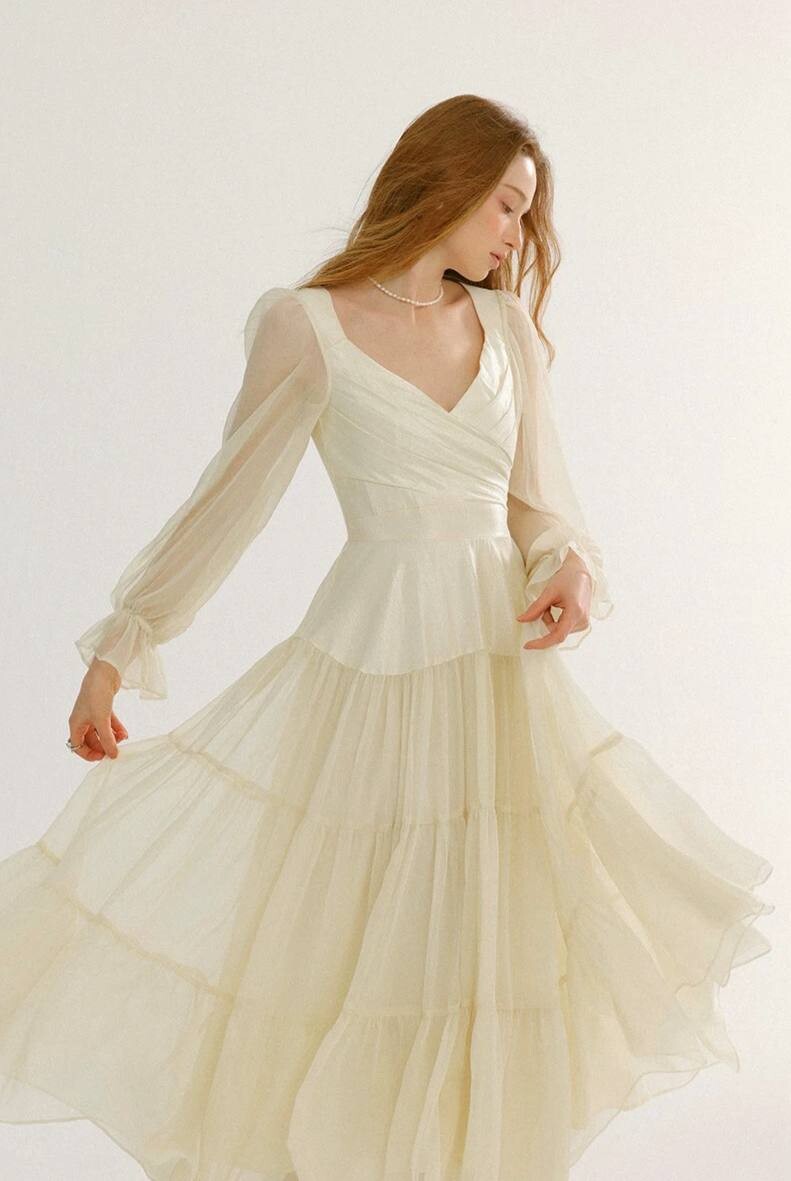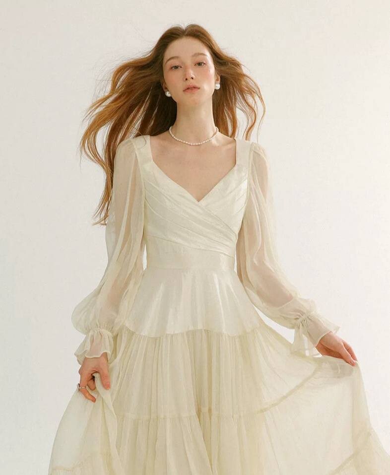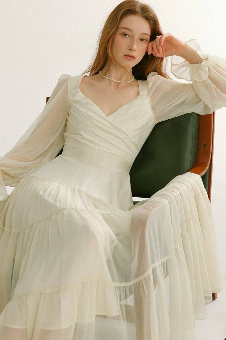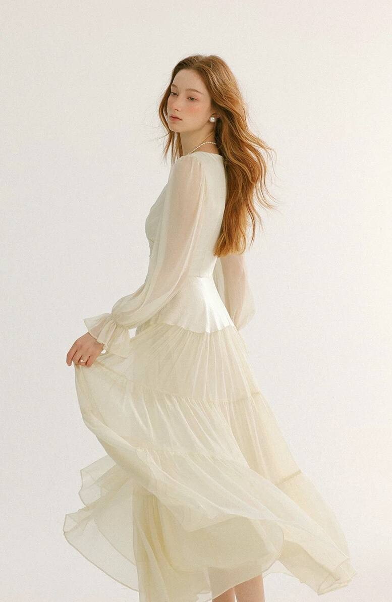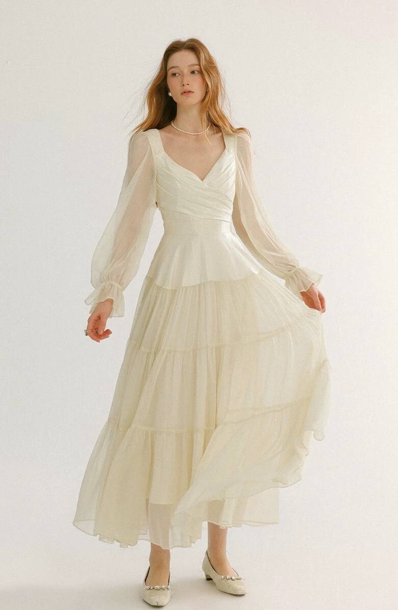 Платье белое в длине миди с длинными рукавами