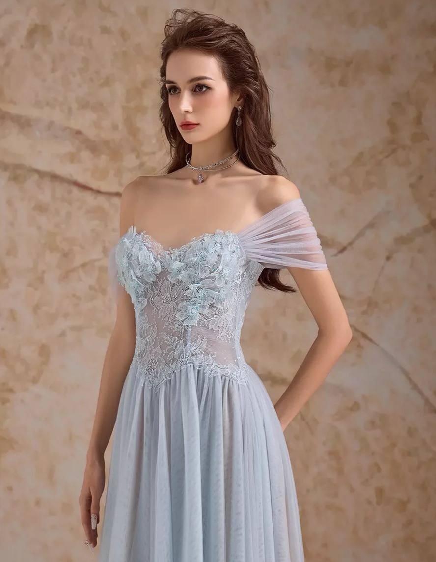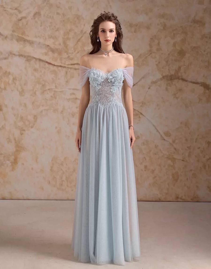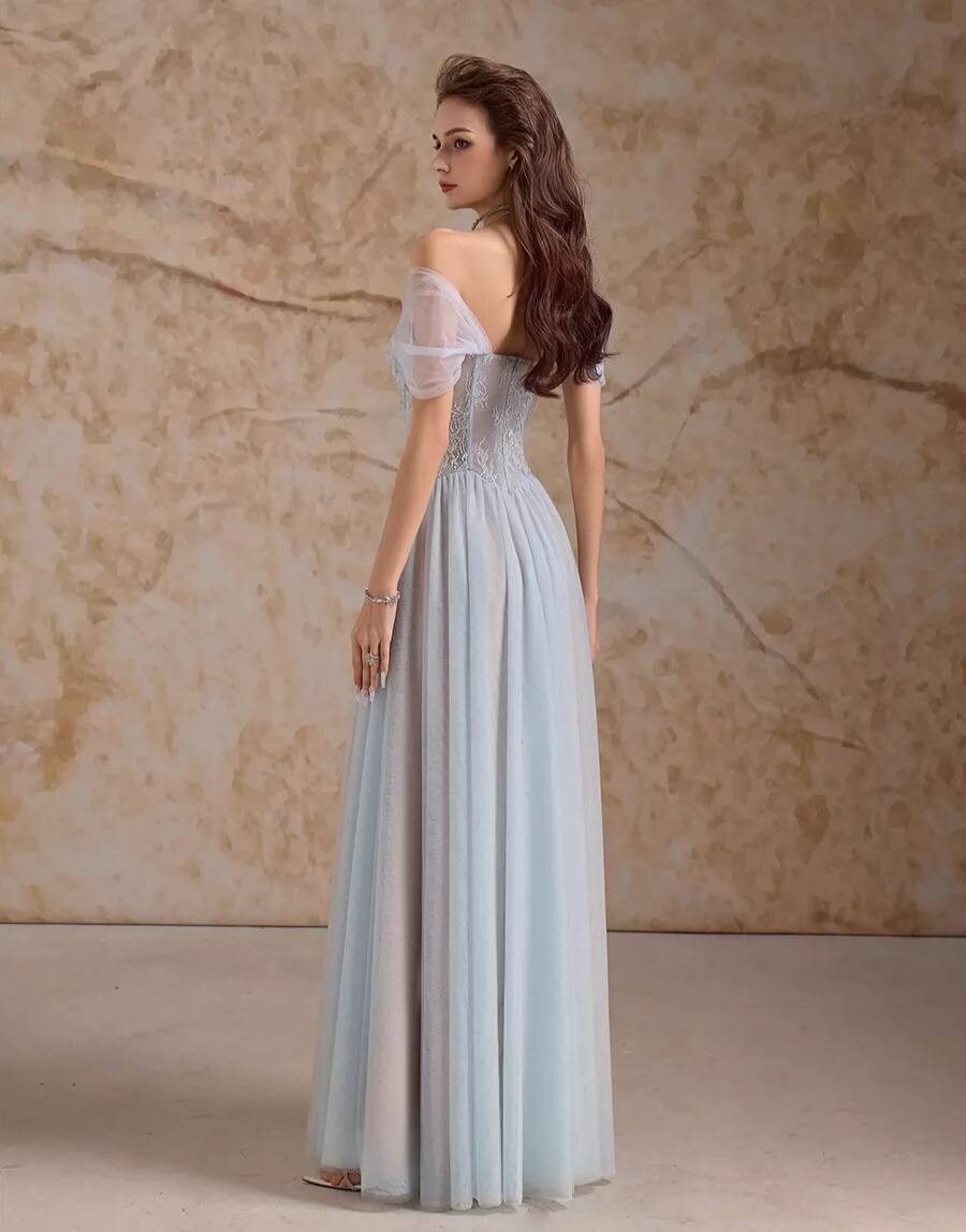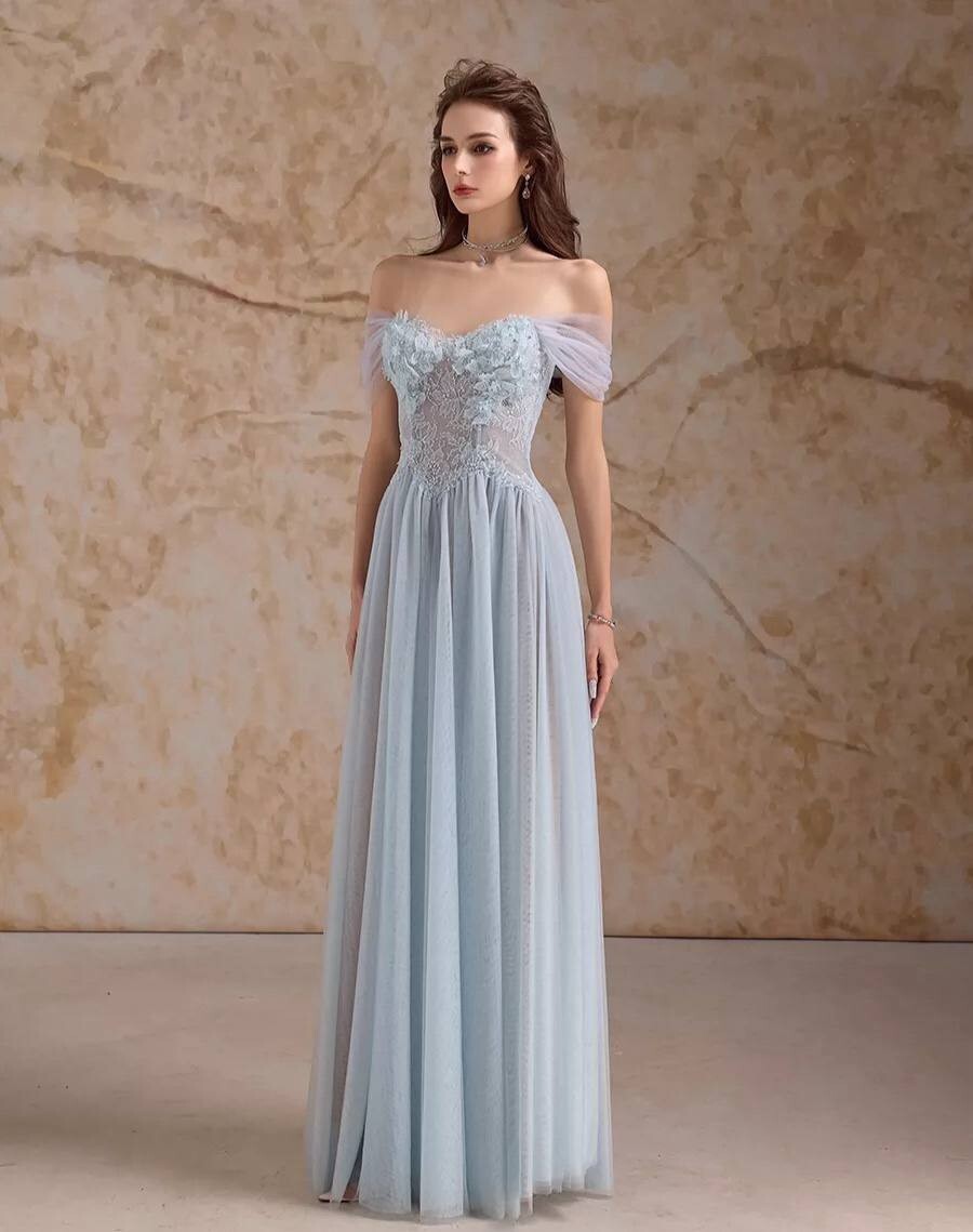Платье-макси на выпускной струящееся с открытыми плечами и кружевом