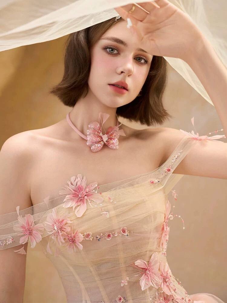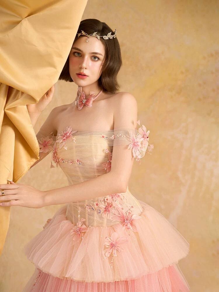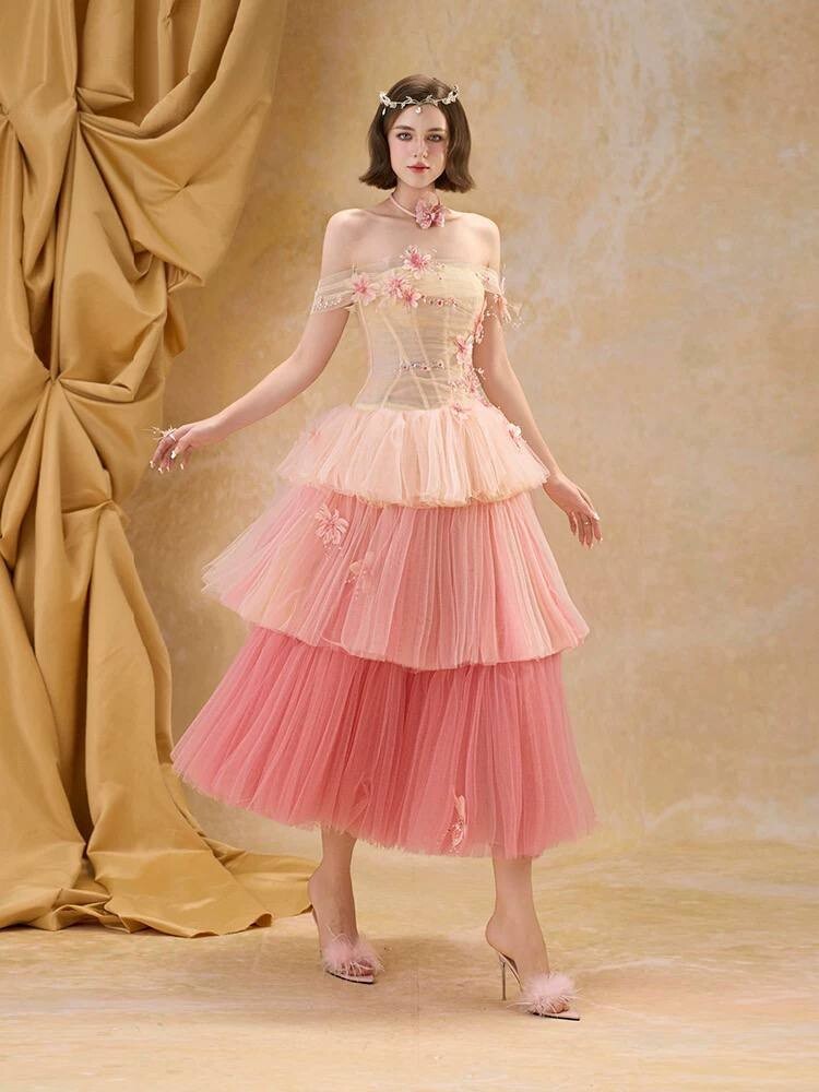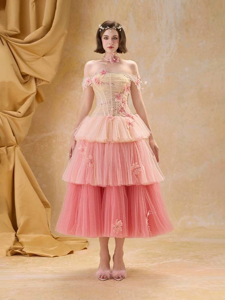 Платье-миди на выпускной многослойное с корсетом и объемными цветами